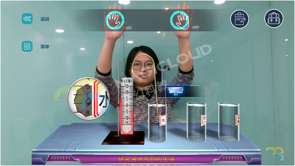 物理仿真實驗室綜合應用AIAR技術,通過3D建模虛擬再現真實的實驗場景,借助先進的體感交互設備Kinect進行虛實互動,將真實的實驗者與虛擬仿真的實驗器材結合到一個畫面里,實驗者實現無需佩戴任何體感設備,純手勢就可以進行實驗互動教學。
