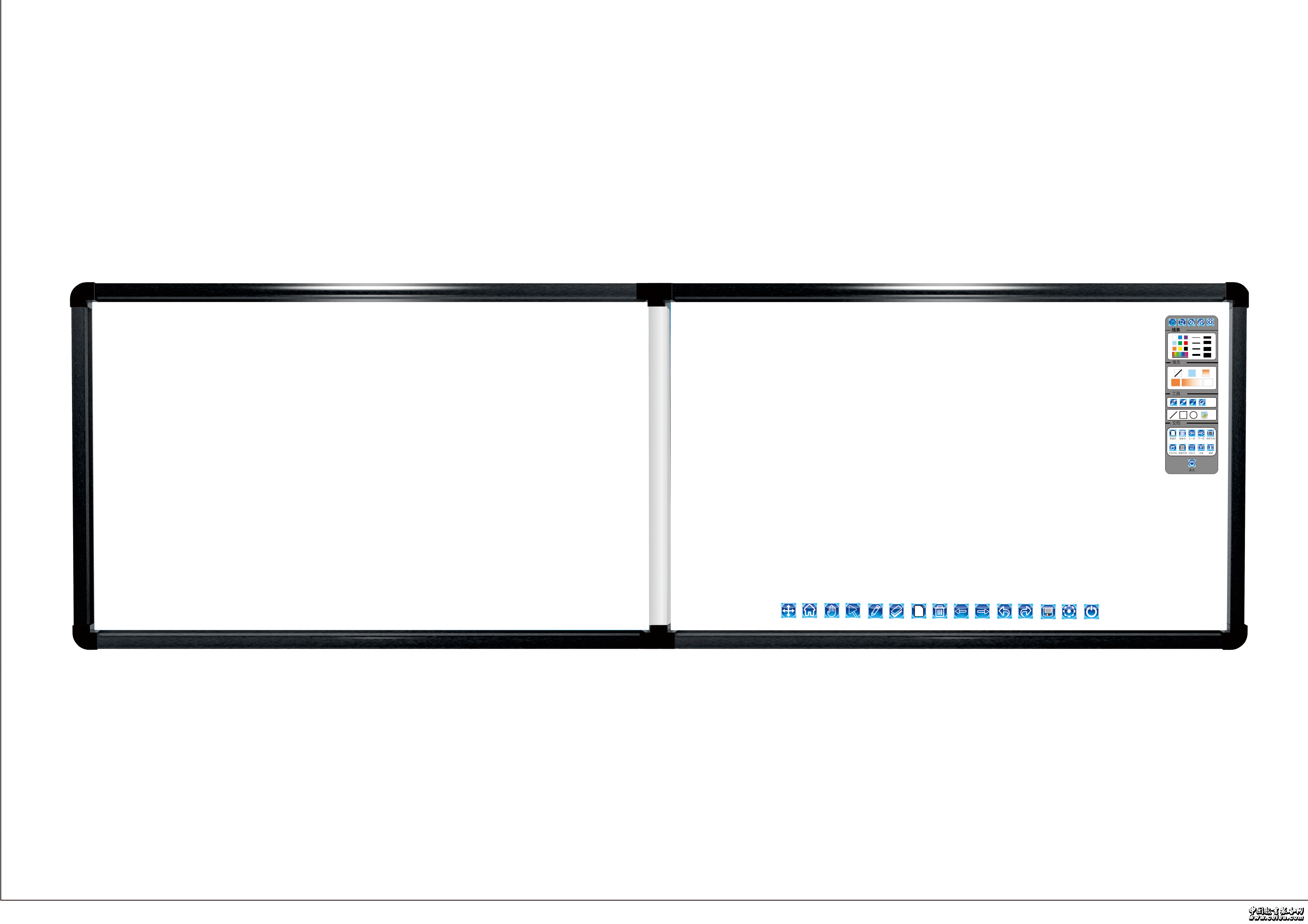 采用兩塊白板拼接方式,一部分作為普通教學(xué)書寫白板,一部分作為互動(dòng)書寫投影白板,兩部分的材質(zhì)是完全相同的互動(dòng)部分可根據(jù)客戶需求定制不同尺寸。