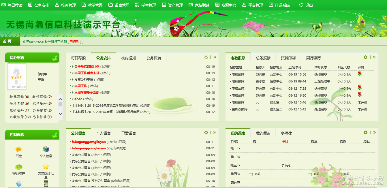 產品詳細介紹平臺管理:學校信息設置、年級設置、班級設置、部門設置、用戶管理、權限設置、教師安排、學生分班安排(含新生入學自動分班功能)、積分信用匯總、系統監控、數據備份與還原、菜單設置等。 留言管理:校內郵件系統功能,包括個人留言、公共留言、已發留言和回收站功能。 內容管理:包括校長薦讀、教師薦讀、校內通知等在內的校內信息以及校內信息管理;其中所有校內信息欄目及權限分配學�?勺杂啥ㄖ�,輕松滿足學校個性化需求。 公文/公務流轉:由簽發人、主辦人、承辦人協同將一項工作完成,公文/公務狀態包括分派中、完成、終止等。 全網檢索:文章檢索、圖片檢索、FLASH動畫檢索、媒體文件檢索、其他文件檢索(doc、xls等)、用戶檢索 周行事歷:由各部門負責人自行安排填寫下周工作內容,由最終負責人審核發布,并支持實名簽讀功能,方便下周工作的有效開展。 備忘錄模塊:實現平臺內所有重要信息的備忘提醒功能,可以對提醒時間進行設置,在待辦事宜中及時提醒等功能。 課表管理:支持水晶排課軟件生成的EXCEL文件可以直接導入本系統課表中,并自動關聯;也可以手工處理課表教師的安排。 文章統計匯總 :教師、學生、家長發布文章分類統計匯總,包括獲得的積分、信用、發布文章數、提供的資料數(doc、xls、圖片、FLASH動畫等)、提供資料的大小、文章閱讀情況等 后勤/總務維修模塊:后勤/總務報修申請、維修處理信息記錄、報修及維修統計等功能。 校車管理模塊:提供校車的使用申請、審批、統計等功能。 資料印制模塊:提供資料與講義即時傳送、分類管理、印制監管、成本控制等功能。 工資管理模塊:為教師提供方便、快捷的薪酬(工資、獎金等)查詢功能。 請假管理模塊:為教師提供快捷的網上請假申請、審批、統計、分析等功能。 調查問卷模塊:提供個性化的問卷調查模板,具有調查題庫的自定義建設、題型類別設置、意見反饋、題型自動統計與分析等功能。 日程安排模塊:為教師提供日程(個人、部門、學校)的安排(每天、每周、每月)與查詢,具有每周日程匯總、查詢與每天日程及時提醒等功能。 教師簽到模塊:為全校教師提供網上簽到管理,包含教師簽到情況匯總,個人簽到記錄,簽到統計等功能。 會議記錄模塊:提供會議管理個性化模板的創建,還具有倒計時、到時提醒、會議效能評估分析、任務流程完成情況的記錄等功能。 電教管理模塊:實現電教器材、專用教室網上登記、申請、審核,實現全校電教器材的申請,待審核的申請、個人申請、使用情況統計等功能。 網絡磁盤:實現學校每個老師的文件夾的個性創建,資料的上傳,學科共享、組內共享、學校共享,文件的刪除等功能。 班級常規管理:電子化班級常規管理,包括常規檢查、早鍛煉、早自習、宿舍衛生、教室衛生、早操、眼保健操、晚自習等日常管理,并能夠形成月報表和學期報表。 專用場館管理:一款專業的教室、實驗室、體育室等的申請使用管理。申請的教室(場地)可以自由設置,并按照學校實際上課節次申請。 校產管理:管理校園的所有財物,并可以分校區,自定義大類與細類,查詢統計,導入導出功能。 信息教室:學校機房設置、機房使用申請、學生上機情況跟蹤等功能。 物品申購:學校物品采購管理,包括采購類別合作、采購價格、采購申請、采購審核以及指定采購人負責最終采購物品等功能。 集體備課:集個人備課、班組備課、全校備課、星級備課等功能為一體的學校綜合備課管理模塊。既能個人備課管理,也可以班組備課中進行集體備課。 加班管理:由加班申請部門負責人申請,由行政管理層教師進行審核通過,并可以統計加班的天數,累計加班費用等功能 每周食譜:管理員將一日三餐的菜譜添加進去,學生和家長可以查看菜譜并可以進行評價 晨檢系統:學校相關老師把每天早上學生出勤情況錄入系統,可以按照班級查詢和學生查詢進行檢索并導出 資產管理:實現資產的入庫與出庫管理及出庫明細跟蹤,統計資產的大類與小類,生成資產的明細表,場地配置及資產使用情況表 教師專業發展:創建教師檔案表格,支持創建教師檔案分類表格,支持自定義控制設置,支持統計下載總記錄和附件 值班管理:學校每日值班信息的記錄與管理,并具備值班信息匯總統計和打印等功能,包括政值班和教師值班。 教師勞績評估:教師評估指標設置及打分功能,為簡易的教師評價系統。 榮譽冊:學校、教師所獲榮譽的登記、統計管理,含榮譽導入功能。所獲榮譽類別可有學校自由建設。 簡易圖書管理:支持創建圖書類別,管理分類圖書的入庫與出庫,借閱記錄可以進行查詢。 掌上校園(移動APP):掌上校園,是基于“蠡風教育系列軟件”,為用戶實時管理學校辦公而開發的一套移動辦公系統。主體分校務通、交流圈(校內微信)、電話本、我 四大模塊。其中校務通包括:網站新聞、校內通知公告、留言管理(校內郵件)、校內飛信(短信群發)、閱讀有痕、問卷調查、公務報修、課表查詢、即時評價、快捷請假、公文流轉、手機簽到、資料印制、用車登記 等; |