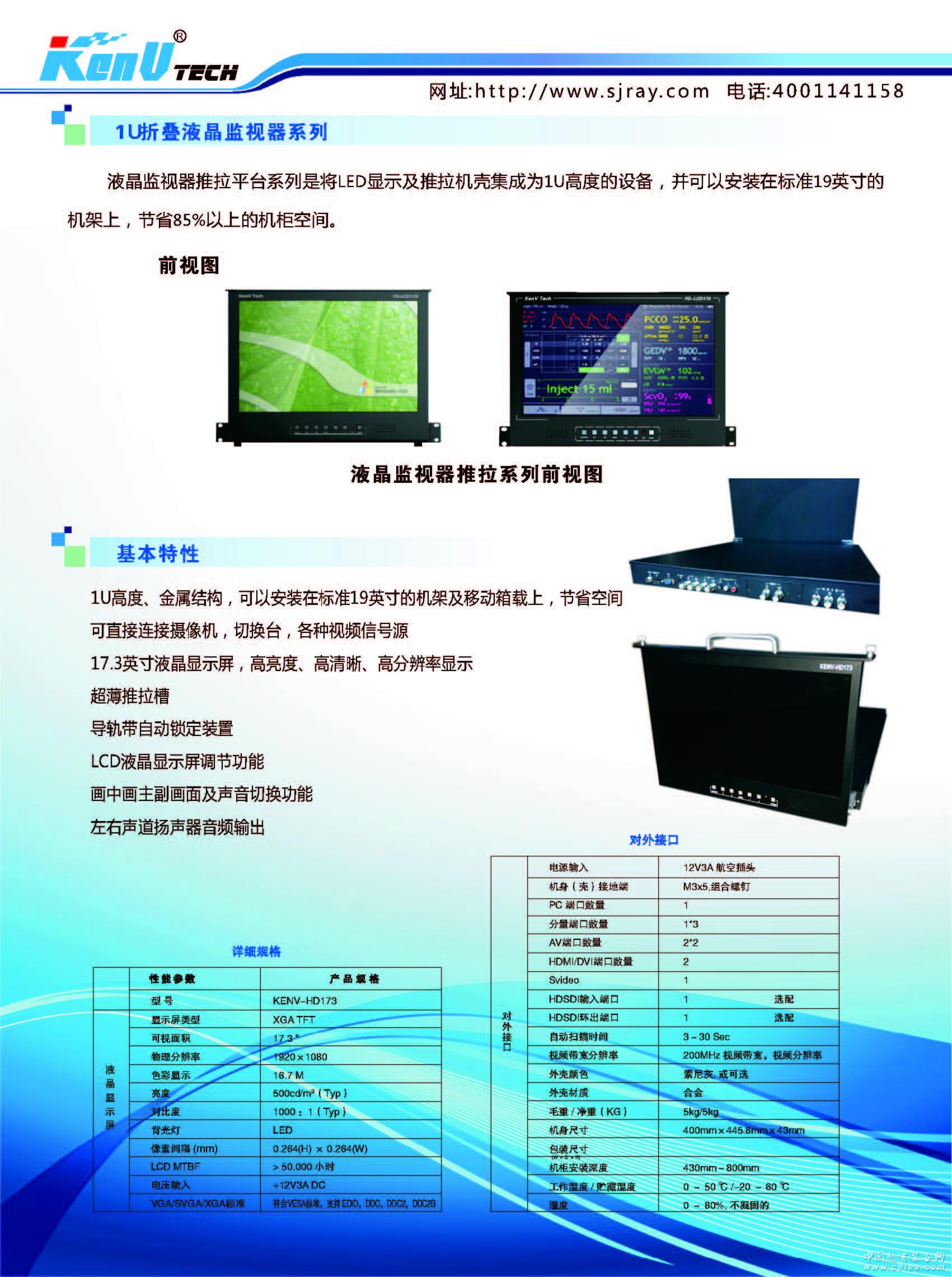 產品詳細介紹DC電源輸入口 (12V 3A) HDMI/DVI輸入口 PC VGA信號輸入端口 分量視頻信號輸入端口 PC雙聲道音頻輸入端口 S-video 視頻信號輸入端口 分量視頻信號輸入端口 兩路AV模擬視頻信號輸入端口 兩路AV模擬視頻信號輸出端口 AV雙聲道音頻輸入端口 HDSDI高標清數字兼容端口 HDSDI高標清數字兼容環出端口 1.2 基本特性 1U高度、金屬結構,可以安裝在標準19英寸的機架及移動箱載上,節省空間 可直接連接攝像機,切換臺,各種視頻信號源 17.3英寸液晶顯示屏,高亮度、高清晰、高分辨率顯示 超薄推拉槽 導軌帶自動鎖定裝置 LCD液晶顯示屏調節功能 畫中畫主副畫面及聲音切換功能 左右聲道揚聲器音頻輸出 1.3 詳細規格 1.3.1液晶顯示屏 性能參數 產品規格 型 號 KENV-HD173 液 晶 顯 示 屏 顯示屏類型 XGA TFT 可視面積 17.3 " 物理分辨率 1920×1080 色彩顯示 16.7 M 亮度 500cd/m2(Typ) 對比度 1000 :1(Typ) 背光燈 LED 像素間隔 (mm) 0.264(H) × 0.264(W) LCD MTBF > 50,000 小時 電壓輸入 +12V3A DC VGA/SVGA/XGA標準 符合VESA標準,支持 EDID,DDC,DDC2,DDC2B 1.3.2對外接口 對外接口 電源輸入 12V3A 航空插頭 機身(殼)接地端 M3x5,組合螺釘 PC 端口數量 1 分量端口數量 1*3 AV端口數量 2*2 HDMI/DVI端口數量 2 Svideo 1 HDSDI輸入端口 1 選配 HDSDI環出端口 1 選配 自動掃描時間 3~30 Sec 視頻帶寬分辨率 200MHz 視頻帶寬,視頻分辨率 外殼顏色 索尼灰, 或可選 外殼材質 合金 毛重 / 凈重(KG) 5kg/5kg 機身尺寸 400mm×445.8mm×43mm 包裝尺寸 (W × D × H) 機柜安裝深度 430mm~800mm 工作溫度 / 貯藏溫度 0 ~ 50 ℃ /-20 ~ 60 ℃ 濕度 0 ~ 80%, 不凝固的 2 安裝 液晶監視器推拉平臺符合標準19英寸機柜的安裝要求,由前向后安裝,后掛耳插入導槽內,安裝好后,鎖緊前/后掛耳。選擇適當長度的后掛耳,可安裝在深度為450mm-800mm的機柜內。(見圖三) 3 操作步驟 3.1 此時將液晶監視器推拉平臺抽出至鎖止,翻開前面板,LCD顯示屏可以翻開至110度,使用時請調整至最佳可視角度,便于操作和使用。(見圖五) 3.2 顯示屏操作 項 目 說 明 ↑ 移動相應按鍵,調節相應功能 ↓ 移動相應按鍵,調節相應功能 MENU 進入LCD功能選項菜單 + 調節音量 (增大) - 調節音量 (減小) Source 信號源選擇PC視頻 分量 Svideo HDMI/DVI HDSDI POWER 打開或關閉LCD電源 3.3 OSD菜單操作 3.3.1 顏色調整 OSD 顏色調整主菜單: 按MENU鍵,畫面顯示OSD主菜單,按MENU鍵,退出OSD菜單 對比度調整: 按MENU鍵,畫面顯示OSD主菜單顏色調整功能,按↑/↓鍵,選擇對比度選項,按+/ - 鍵,進行對比度調整 亮度調整: 按MENU鍵,畫面顯示OSD主菜單色調整功能,按↑/↓鍵,選擇對亮度選項,按+/ - 鍵,進行亮度調整 色飽和度調整: 按MENU鍵,畫面顯示OSD主菜單顏色調整功能,按↑/↓鍵,選擇色飽和度選項,按+/ - 鍵,進行色飽和度調整 清晰度調整: 按MENU鍵,畫面顯示OSD主菜單顏色調整功能,按↑//↓鍵,選擇色飽和度選項,按Vol+/ vol- 鍵,進行色飽和度調整 色調調整: 按MENU鍵,畫面顯示OSD主菜單顏色調整功能,按↑//↓鍵,選擇色調選項, 按+/ - 鍵,進行色調調整 3.3.2 音量調整 按+/ - 鍵進行音量調整 按+ 擴大音量 按- 減小音量 3.3.3 輸入信號選擇 按SOURCE鍵 進入信號選擇界面,按↑/↓選擇輸入的信號類型,+/ -確定多選的信號