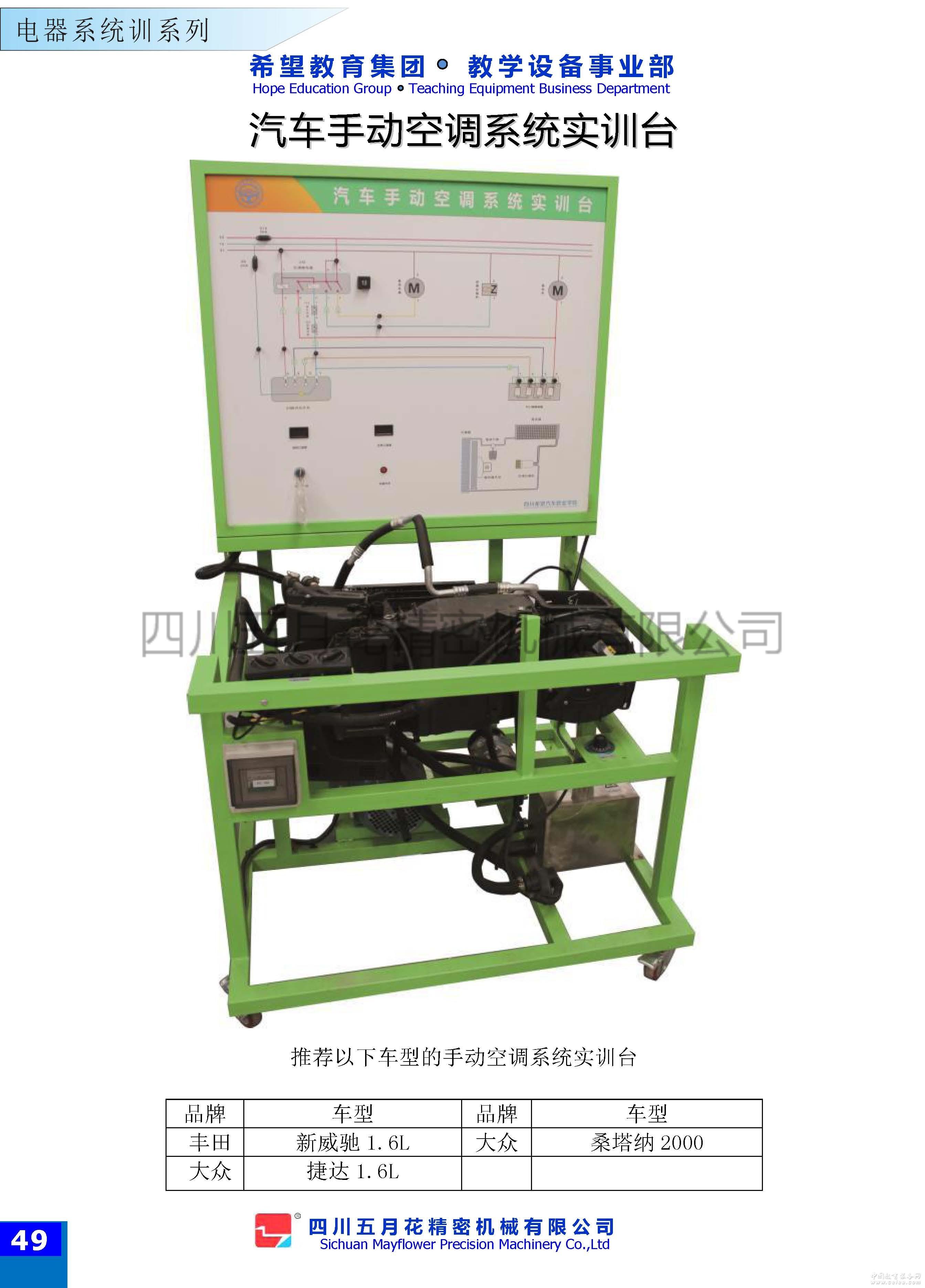 該設備采用豐田新威馳1.6汽車手動空調系統為基礎,充分展示汽車手動空調系統的組成結構和工作過程。適用于各類院校和培訓機構對汽車手動空調系統理論和維修實訓的教學需要。