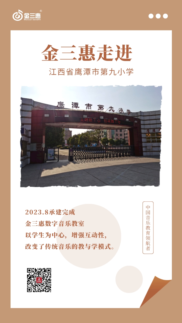 2023年8月,金三惠數字音樂教室走進江西省鷹潭市第九小學,為學生提供了45+1的電鋼琴教室,配備了金三惠電鋼琴教學系統、電鋼琴、數字音樂教學儀等教學教具等。