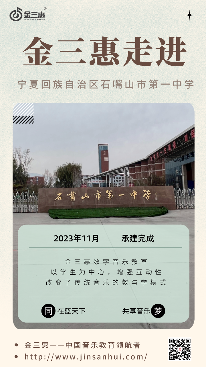 2023年11月,金三惠數字音樂教室為寧夏回族自治區石嘴山市第一中學提供、安裝、培訓的8+1智慧創客音樂教室正式開始使用!配備了金三惠教學系統、電鋼琴、數字音樂教學儀等教學教具。創客教室-金三惠 (jinsanhui.com)