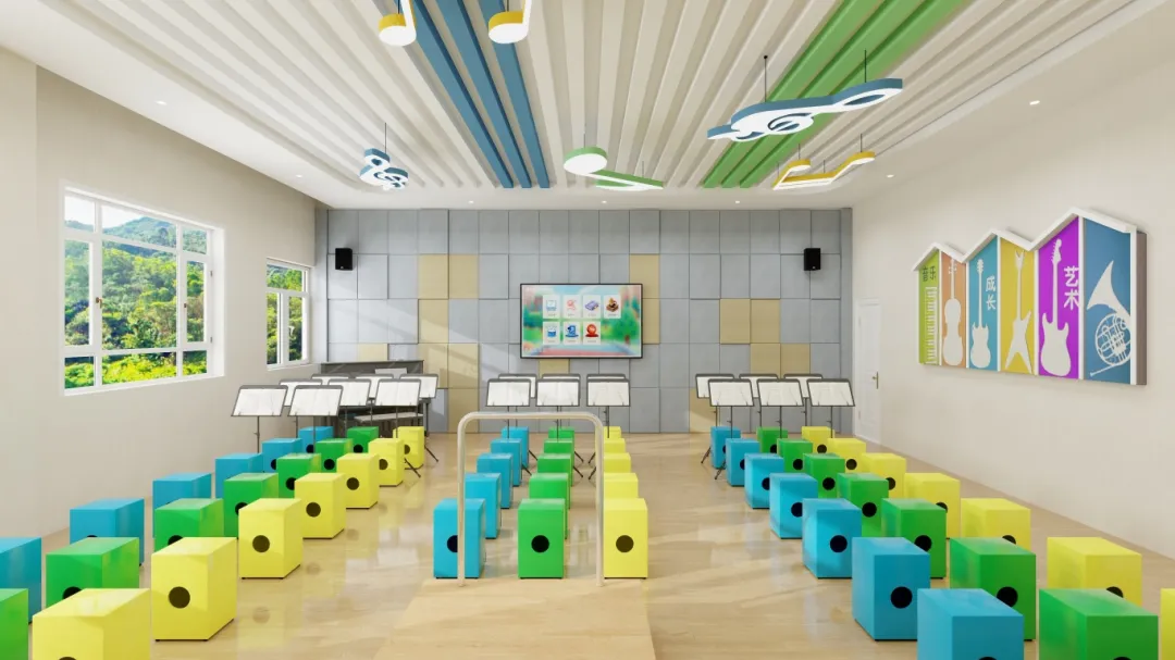 教室滿足中小學音樂與唱游課程教學要求,配備多種樂器、教具、課程資源等,能夠滿足學生聆聽、欣賞、演奏、創(chuàng)作、排練的需求,培養(yǎng)學生的創(chuàng)造力、自信心、專注性、合作精神、反應能力及全面人格發(fā)展,享受音樂帶來的快樂。
