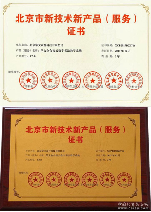 北京華文眾合科技有限公司生產(chǎn)的“智云+數(shù)字書法教學(xué)系統(tǒng)”,在眾多產(chǎn)品中嶄露頭角,經(jīng)過認(rèn)定小組聯(lián)合審定,最終獲得“北京市新技術(shù)新產(chǎn)品(服務(wù))證書”。