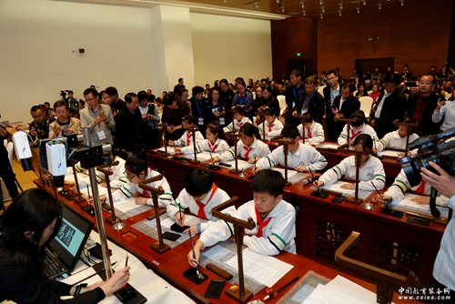 會(huì)中,北京天壇東里小學(xué)的老師和同學(xué)們,使用華文眾合開(kāi)發(fā)的“智云+”數(shù)字書(shū)法教室示范信息化書(shū)法課堂。傳統(tǒng)的筆墨紙硯,在交互式數(shù)字臨摹臺(tái)上,借助華文眾合的智能書(shū)法教育系統(tǒng),為300多名與會(huì)者展示了一堂生動(dòng)有趣頗有效率的書(shū)法課。