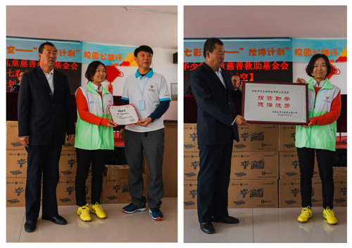 中華兒慈會七彩天空合作項目主任李鋼為華文眾合頒發慈善榮譽證書,黑山嘴小學鮑校長給華文眾合授了感謝牌匾。