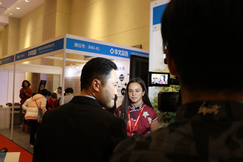 CGTN首席記者孟慶生大會現(xiàn)場針對華文眾合智慧書法教室進行采訪