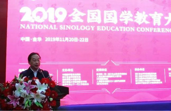 11月21日,由中國國學(xué)教育共同體、浙江省金華市教育局、曲阜師范大學(xué)國學(xué)院、浙江師范大學(xué)教師教育學(xué)院、金華市關(guān)心下一代工作委員會主辦的“2019全國國學(xué)教育大會”在婺城金華隆重舉行。原文化部副部長潘震宙,中國留學(xué)發(fā)展人才基金會漢學(xué)研究院院長張健,孔子七十五代孫、世界儒學(xué)大會秘書長、中國孔子研究院副院長孔祥林,教育部原國家督學(xué)、教育部《中小學(xué)書法教育指導(dǎo)綱要》研制組專家、華文眾合書畫研究院專家張鳳民等領(lǐng)導(dǎo)出席會議,來自全國12個(gè)省的280余名國學(xué)教育專家學(xué)者共同參會。