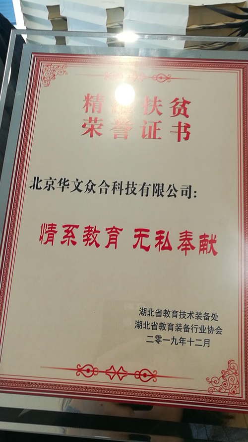 2019年12月,華文眾合給湖北省恩施州巴東縣信陵鎮(zhèn)民族實驗小學捐贈了一間智慧書法教室,獲得了湖北省教育裝備行業(yè)協(xié)會授予的愛心企業(yè)獎牌。