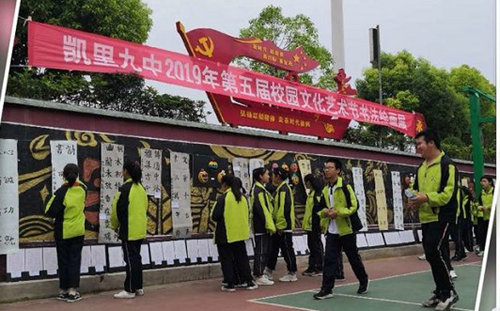 凱里九中2019年的校園文化藝術節舉行了書法比賽,同時在校園內展出了同學們的書法和繪畫作品,頗具神韻的書法作品引起了同學們的熱烈圍觀。