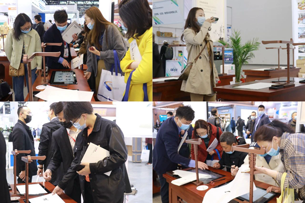 走進華文眾合展位,第七代智慧書法臨摹桌整齊劃一,透過宣紙可以看到屏幕上清晰的古帖。參觀者紛紛入座,拿起筆架上的毛筆認真臨摹起來。