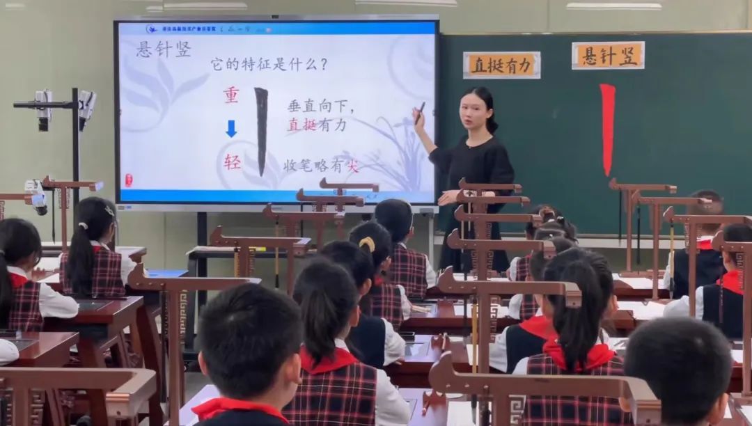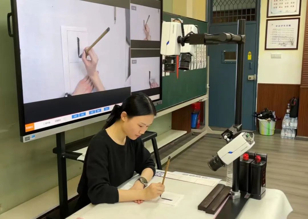 在活動現(xiàn)場,授課教師何悅利用華文眾合智慧書法教室為學生們上了一節(jié)別開生面的書法課”。通過直播授課把“懸針豎”的起筆、行筆、運筆、收筆從三個角度進行展示,并同步到每個學生端;通過互動系統(tǒng)更清晰快速地指導學生的書法練習細節(jié);通過邊看邊練讓學生的書法臨摹變得更高效。應(yīng)用華文眾合智慧書法教室的各項功能,很好地展示了書法教學細節(jié),提升了書法教學質(zhì)量。