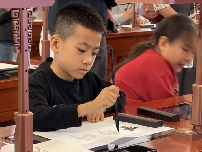 小朋友和外國友人也被吸引過來體驗智慧書法,傳統文化的種子不僅在孩子們心中悄悄萌芽,也通過外國友人散播到世界各地。