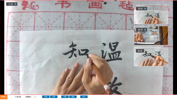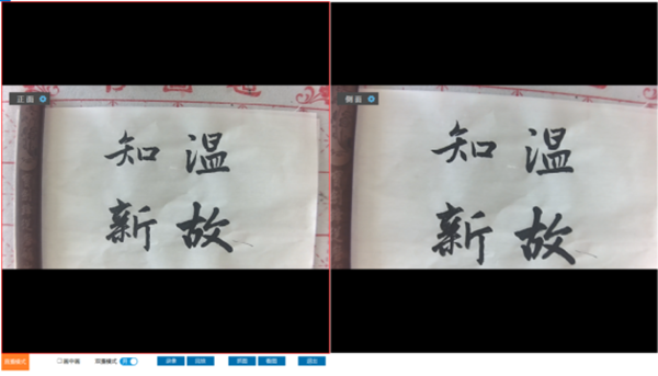 書畫教學(xué)展示臺由3臺攝相機(jī)組成,正面和側(cè)面攝像頭分別從正上方、左上方對書寫過程進(jìn)行拍攝,特寫攝像頭正前方對教師授課進(jìn)行怕拍攝,支持手動(dòng)調(diào)焦。