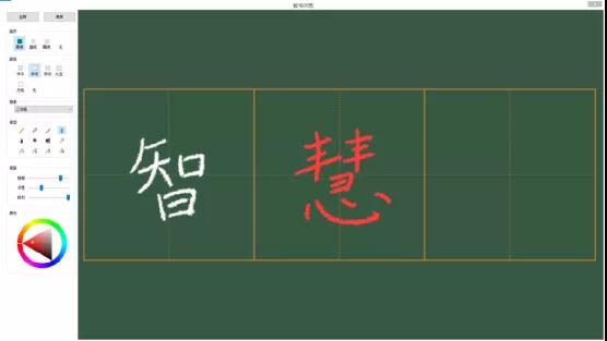 板書示范用于協助教師組織教學活動,為書法教師提供豐富的書寫格式和書寫模式。其中,板書書寫模式有無紋、黑板、宣紙、面布四種顯示方式;底格提供了米字格、田字格、田回格、九宮格、方格、無格等顯示方式;筆類提供了鉛筆、鋼筆、毛筆、軟筆、水彩筆、刀筆等書寫效果及不同色彩,為教師的示范提供豐富的模版。使用步驟如下: