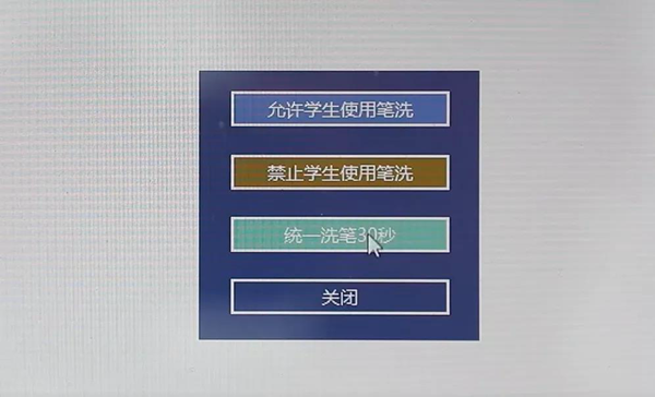 在華文眾合智慧書法教室系統界面,鼠標上移至屏幕頂端任意位置,會出現一排快捷菜單,點擊筆洗,會彈出筆洗功能菜單,點擊【統一洗筆30秒】,學生端的筆洗器就會出水30秒。這時候可以讓學生進行洗筆或潤筆的操作。出水30秒后會自動停水。