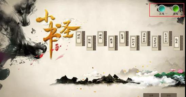 在華文眾合智慧書法教室系統界面,鼠標上移至屏幕頂端任意位置,會出現一排快捷菜單,點擊筆洗,會彈出筆洗功能菜單,點擊【允許學生使用筆洗】,此時,學生端會出現筆洗控制按鈕。