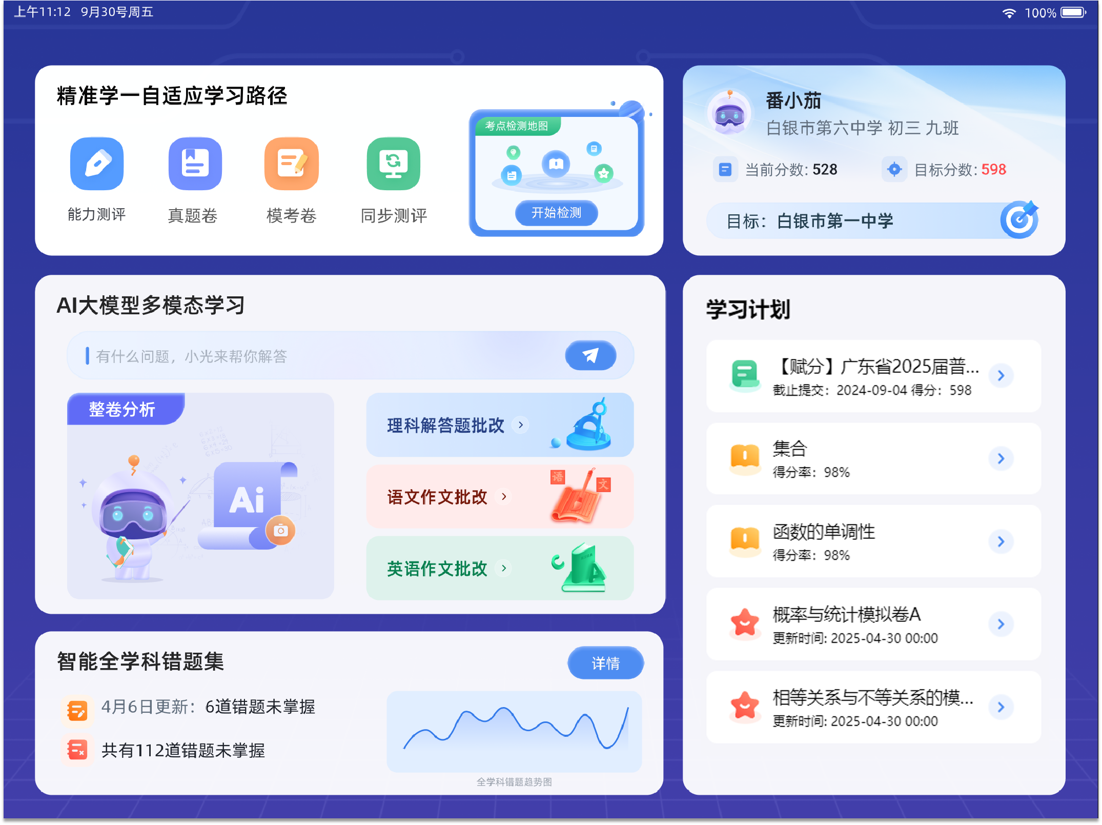 光大AI自習室無縫對接校內考試系統,構建“考試錯題+自習軌跡+自拍錯題”三位一體的學情數據庫,突破學情數據孤島。