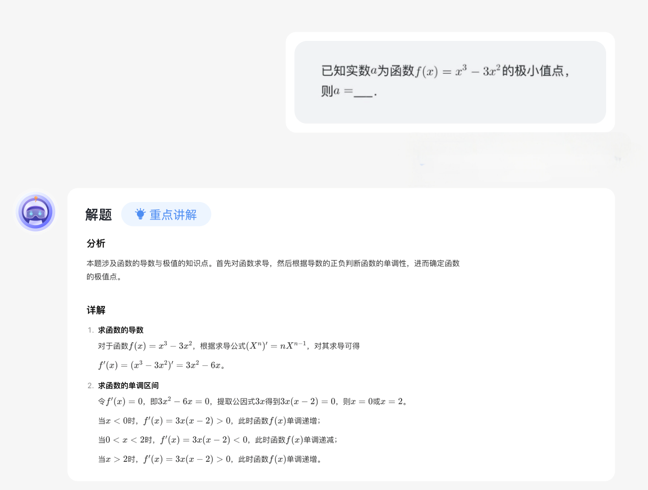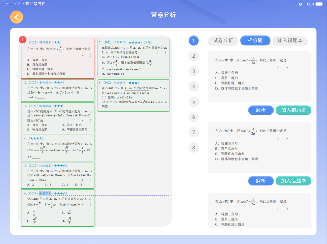 拍照上傳整份試卷,AI自動拆解成單題并提供解析,還會推送相似題型,幫助學生鞏固知識。