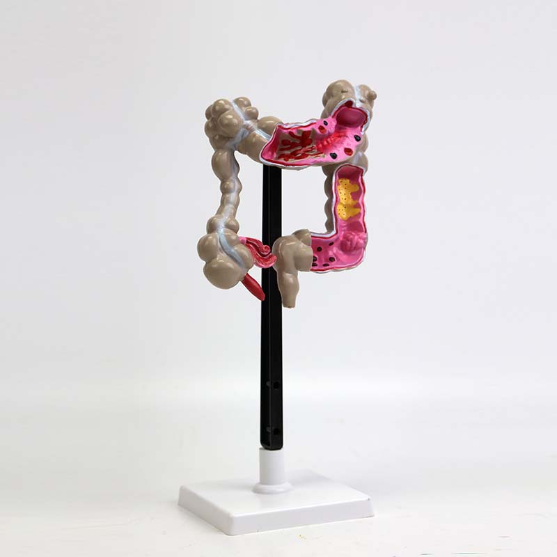 本模型展示人體結腸正常結構與多種典型病理變化,直觀呈現結腸息肉、炎癥、潰瘍、梗阻及腫瘤等病變形態與部位,對比清晰、病灶明顯,用于醫學教學、健康科普及臨床病理演示,幫助理解結腸疾病特征與危害。