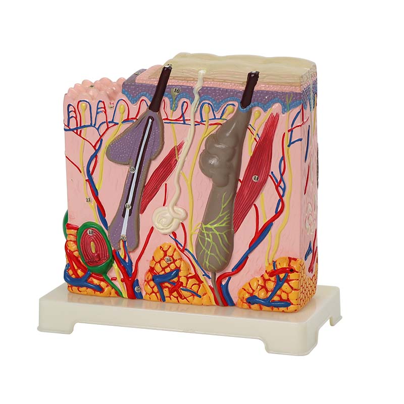 皮膚結(jié)構(gòu)模型清晰展示皮膚的表皮、真皮、皮下組織三層結(jié)構(gòu),附帶毛發(fā)、皮脂腺、汗腺、血管、神經(jīng)等細節(jié),直觀呈現(xiàn)皮膚的保護、分泌、感知等生理功能。模型結(jié)構(gòu)準(zhǔn)確、層次分明,適用于中小學(xué)生物教學(xué)與健康科普,幫助理解人體皮膚構(gòu)造與作用。