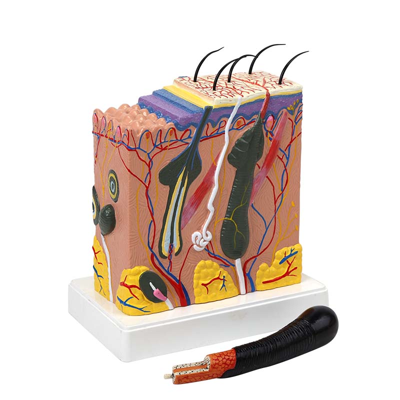 皮膚結構模型清晰展示皮膚的表皮、真皮、皮下組織三層結構,附帶毛發、皮脂腺、汗腺、血管、神經等細節,直觀呈現皮膚的保護、分泌、感知等生理功能。模型結構準確、層次分明,適用于中小學生物教學與健康科普,幫助理解人體皮膚構造與作用。