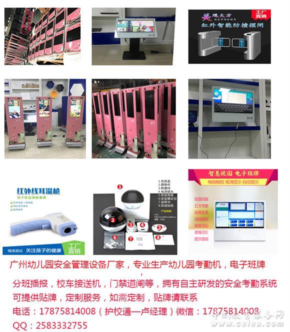 產(chǎn)品詳細(xì)介紹廣州護(hù)校通專業(yè)校園安防廠家,主要為各大營銷公司和校園,提供校園安防設(shè)備和定制生產(chǎn)業(yè)務(wù)。主營產(chǎn)品有幼兒園打卡機(jī),電子班牌,道閘,校車刷卡機(jī),分班播報(bào)等。 護(hù)校通經(jīng)營校園安防設(shè)備多年,經(jīng)驗(yàn)豐富,能及時(shí)處理產(chǎn)品問題。擁有4000方生產(chǎn)廠房,分為生產(chǎn)車間和組裝車間,配備大型生產(chǎn)設(shè)備,廠房有著專業(yè)的生產(chǎn)團(tuán)隊(duì)和組裝團(tuán)隊(duì),員工達(dá)100多人。護(hù)校通有著一套完善的生產(chǎn)管理體系,生產(chǎn)效率高,產(chǎn)品質(zhì)量一流。護(hù)校通還有300方獨(dú)立營銷中心,有著專業(yè)軟件技術(shù)人員,銷售,售后團(tuán)隊(duì)能為客戶提供全方位的服務(wù)。 護(hù)校通產(chǎn)品系列豐富,幼兒園打卡機(jī)有三大安裝方式(壁掛式,立式弧度,立式)四大尺寸(10.1寸15.6寸21.5寸32寸) 幼兒園打卡機(jī)功能詳情: 1、刷卡接送:采用先進(jìn)的非接觸式 IC智能卡技術(shù),作為接送人員標(biāo)識(shí),刷卡提高了接送幼兒的安全性,持無效卡接送系統(tǒng)將出現(xiàn)報(bào)警。 2、顯示接送人照片:幼兒離園時(shí)由接送人在刷卡設(shè)備上進(jìn)行刷卡,系統(tǒng)將顯示兒童和接送的信息與照片,幫助門衛(wèi)分辨接送人是否為幼兒家屬。 3、拍照記錄:護(hù)校通刷卡機(jī)裝配有高清攝像頭,接送人在刷卡設(shè)備上進(jìn)行刷卡時(shí),系統(tǒng)會(huì)自動(dòng)拍照存儲(chǔ),持無效卡刷卡,無任何反應(yīng)。 4、幼兒信息管理:系統(tǒng)可管理幼兒生源、班級(jí)、升級(jí)、插班、退學(xué)等信息,可記錄家長電話、接送人照片,使您輕松全面的管理幼兒信息 5、出勤報(bào)表匯總:系統(tǒng)可進(jìn)行缺勤管理(缺勤的時(shí)間、事由),并能查看各班每日、每周、每月的出勤匯總報(bào)表,便于老師查看匯總信息。 6、微信端提醒:家長通過關(guān)注護(hù)校通公眾號(hào),當(dāng)接送人刷卡時(shí),系統(tǒng)會(huì)自動(dòng)發(fā)送接送信息給指定手機(jī)。 幼兒園打卡機(jī)參數(shù): 系統(tǒng)版本:Android 4.4及以上。 2.攝像頭功能和智能刷卡功能; 3.內(nèi)置高品質(zhì)音箱喇叭,音色完美; 4.金屬質(zhì)感,新款高檔模具! 5.鏡面鋼化玻璃面板,高端大氣,有效保護(hù)液晶屏幕; 6.工業(yè)級(jí)散熱標(biāo)準(zhǔn),延長機(jī)器使用壽命; 7.操作簡單,系統(tǒng)穩(wěn)定; 8.CPU:全志A20雙核處理器/A31四核處理器/A83八核處理器 9.運(yùn)行內(nèi)存:1G/2G 10.機(jī)身內(nèi)存:4G/8G 11.顯示:原裝顯示屏、高清分辨率 11.有線網(wǎng)絡(luò):RJ45 12.無線網(wǎng)絡(luò):支持WIFI 13.數(shù)據(jù)傳輸協(xié)議:TCP/IP通訊協(xié)議 14.電源:AC 220V 15.使用環(huán)境溫度:(-10℃) -70℃ 濕度10%-90% 16.視頻攝像:200萬像素,廣視角達(dá)130度,高清彩色攝像頭 17.USB接口:USB2.0高速接口 護(hù)校通生產(chǎn)幼兒園打卡機(jī)多年,產(chǎn)品銷售遍布全國,多年來,客戶在使用期間,產(chǎn)品未出現(xiàn)過質(zhì)量問題,退換貨也極少發(fā)生,得到了各大學(xué)校和營銷公司的一致好評(píng)。護(hù)校通一直以優(yōu)質(zhì)的產(chǎn)品,實(shí)惠的價(jià)格與向各大公司供貨,只需五十臺(tái)便可以定制生產(chǎn),定制你想要的尺寸,logo。給你一個(gè)最實(shí)惠的價(jià)格,降低你的運(yùn)營成本,提升你的利潤空間。 護(hù)校通承諾凡是購買本司的幼兒園刷卡機(jī),都可以享受到兩年保修,半年內(nèi)包來回運(yùn)費(fèi)。 如需購買,批發(fā),定制幼兒園打 |