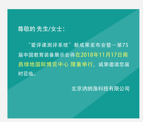 “愛(ài)評(píng)課測(cè)評(píng)系統(tǒng)”新成果發(fā)布會(huì)——暨“第75屆中國(guó)教育裝備展示會(huì)”將在2018年11月17日,南昌綠地國(guó)際博覽中心隆重舉行!