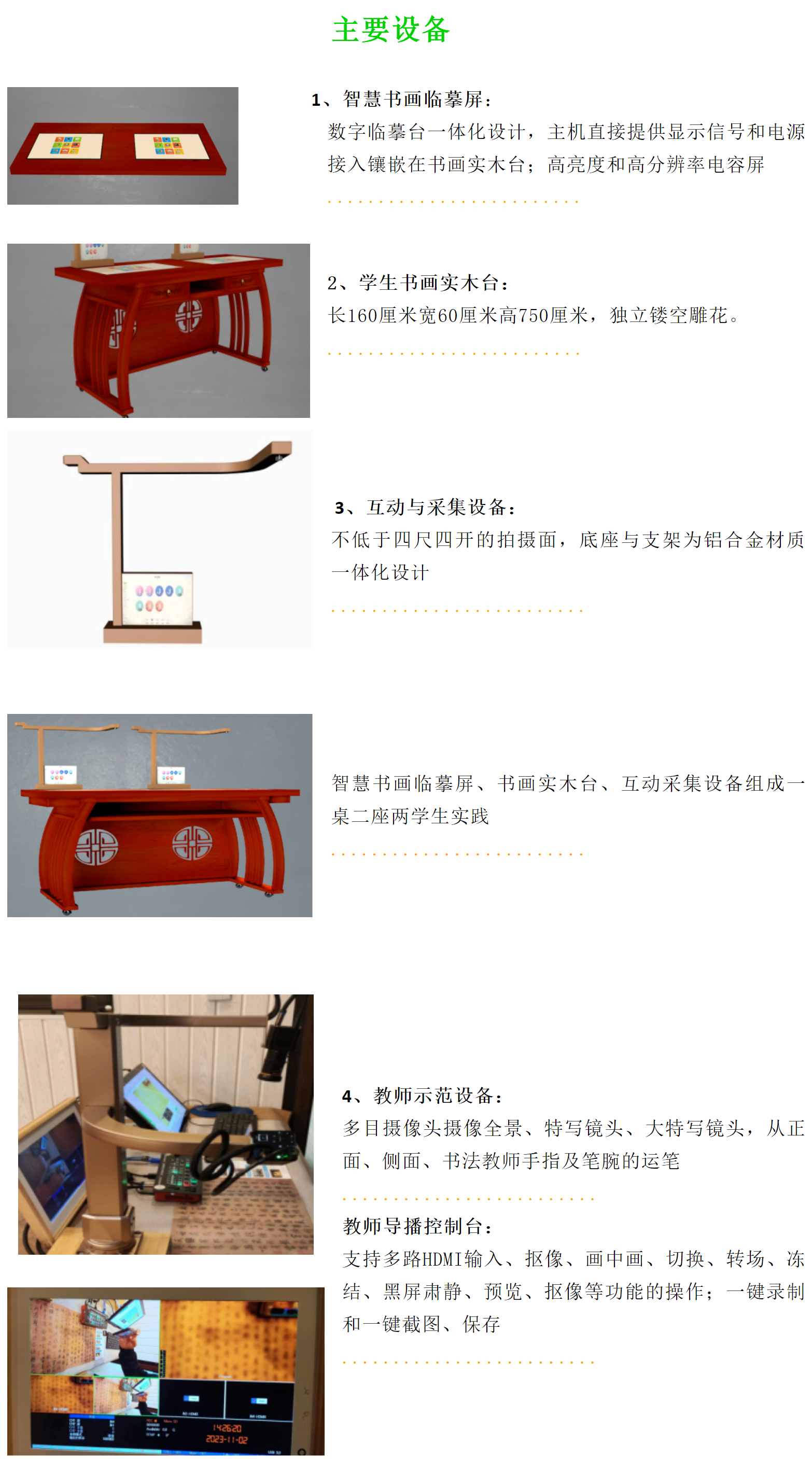 智慧書畫教室 新技術(shù)與學(xué)科融合的美育空間、保留傳統(tǒng)筆墨紙、傳統(tǒng)書法臨摹練習(xí),運用信息化多媒體技術(shù)、交互技術(shù)、智能硬件,提供豐富的課件、碑帖、國畫經(jīng)典、書法示范視頻、學(xué)生創(chuàng)意國畫教程等豐富的教學(xué)資源,服務(wù)師生書法和國畫賞析、教學(xué)、學(xué)習(xí)傳統(tǒng)文化、傳承傳統(tǒng)文化的場景和環(huán)境。書畫硬件+“教學(xué)測評管”軟件+服務(wù)為核心,實現(xiàn)課堂學(xué)習(xí)高效、教學(xué)成果保存和呈現(xiàn)數(shù)字化。