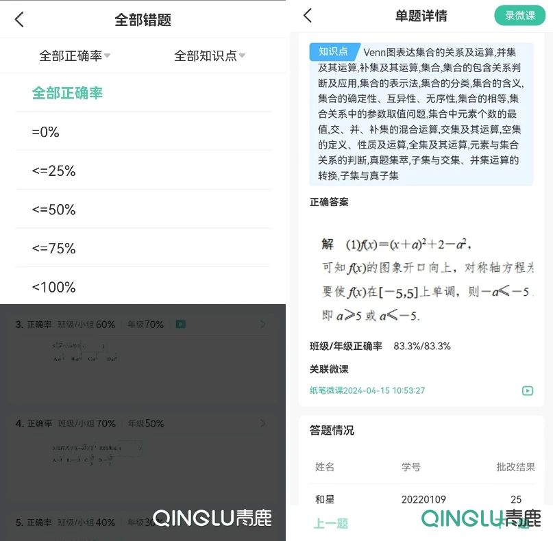 借助青鹿智慧作業APP,教師可查看到往期作業中,班級學生的所有錯題記錄,更精確、清晰地把握學生學情,有效提高工作效率。