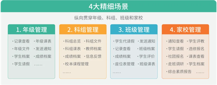 核心業(yè)務(wù)應(yīng)用平臺:基于業(yè)務(wù)邏輯打通、數(shù)據(jù)自動歸檔、實用易用原則,擁有80+功能模塊,管理場景全覆蓋,幫助管理人員和教師減負(fù)、提高工作效率。