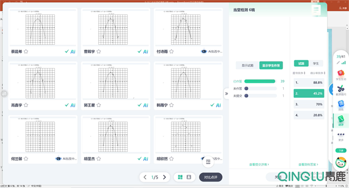 隨后,曹老師通過青鹿智慧紙筆系統(tǒng)推送個性化隨堂檢測,學生使用智慧筆完成作答后,系統(tǒng)進行AI批改,快速生成答題統(tǒng)計,全班正確率一目了然,為精準教學提供實時數(shù)據支撐。