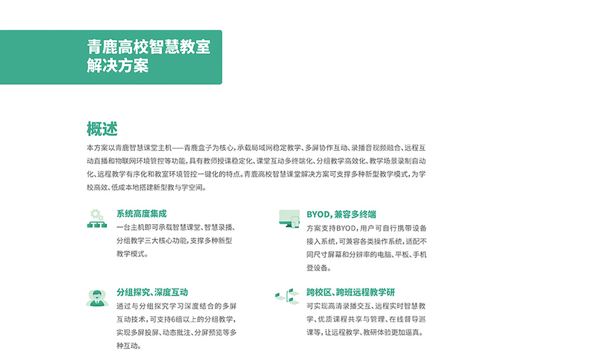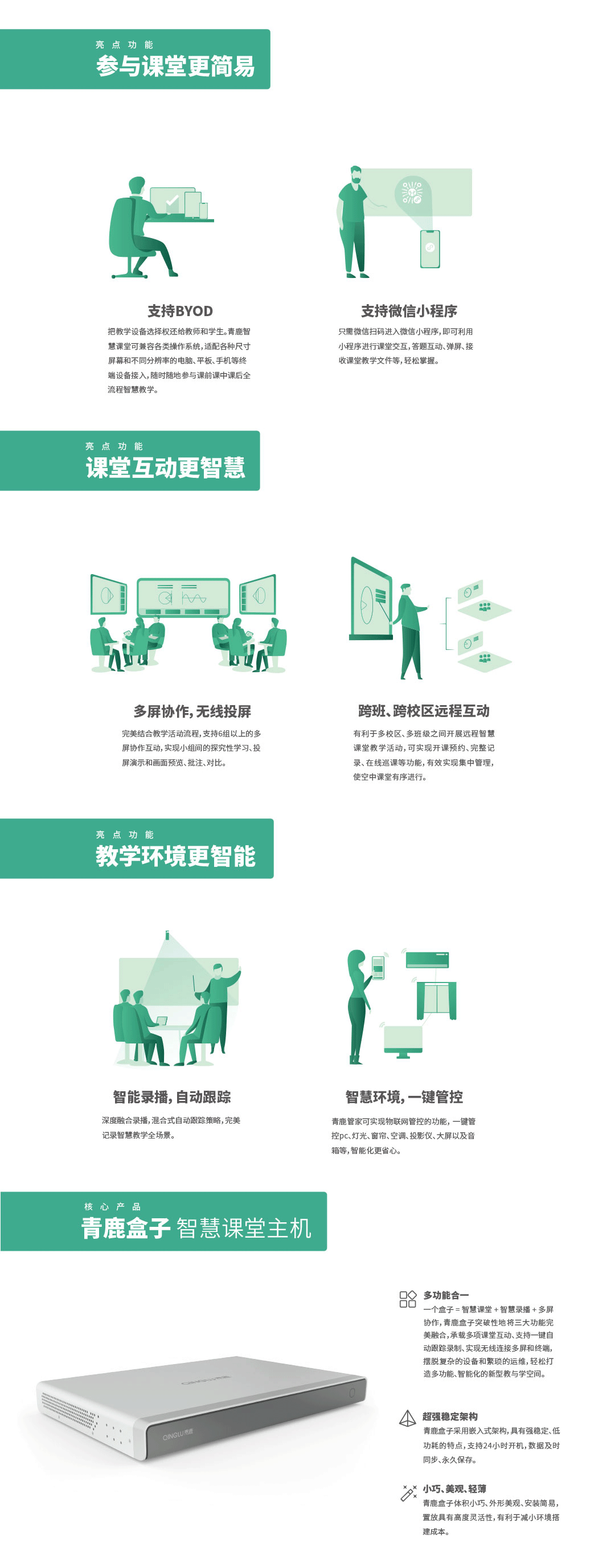 | 智慧教育信息化整體解決方案提供商,我們提供集智慧紙筆課堂、智慧錄播為一體的智慧教學(xué)環(huán)境,提供一套可廣泛應(yīng)用于K12學(xué)校信息化整體建設(shè)的開放式底層平臺(tái),為學(xué)校的教學(xué)和管理質(zhì)量提升提供支撐,賦能教育的數(shù)字化轉(zhuǎn)型。 |