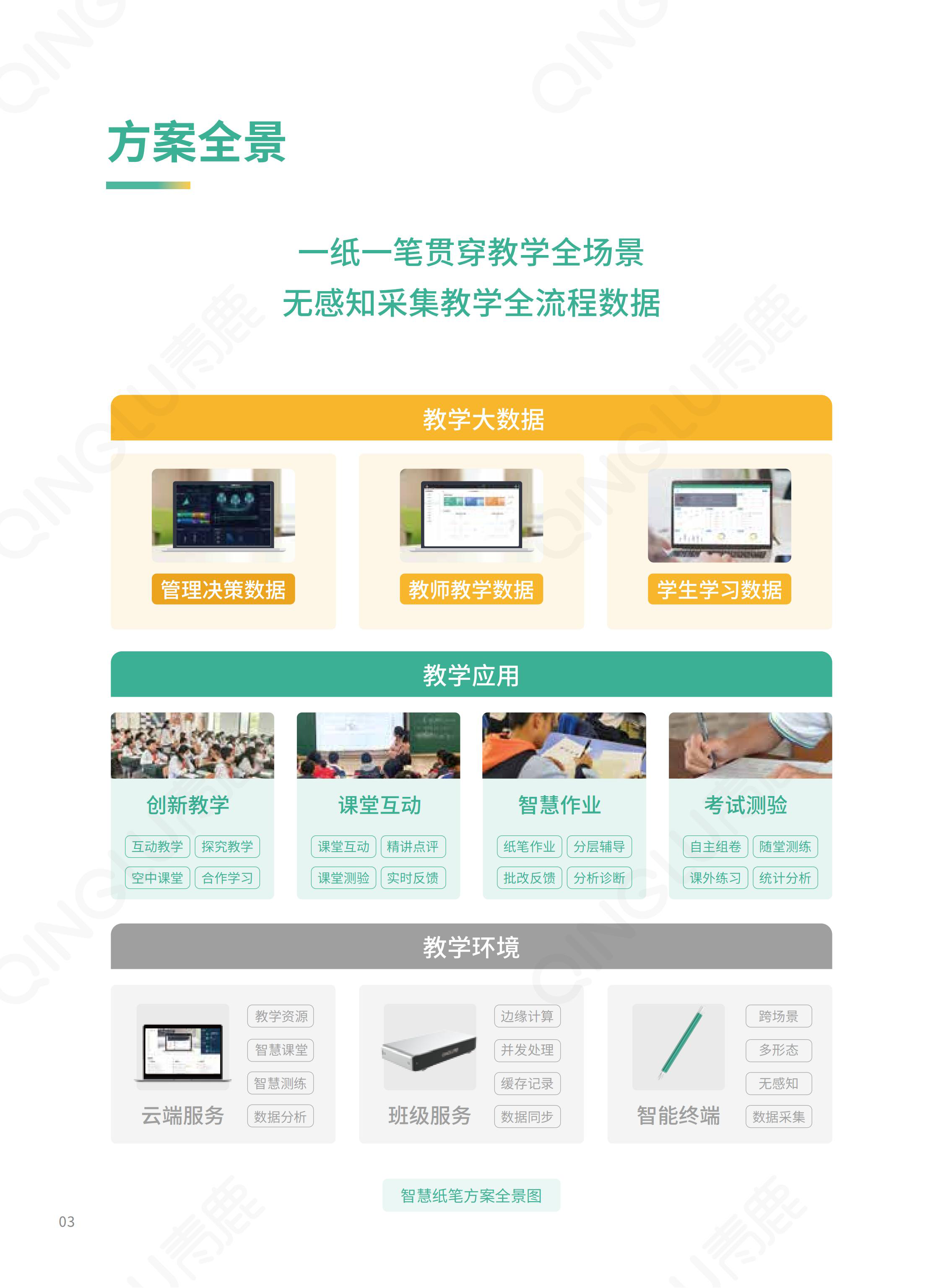 智慧教育信息化整體解決方案提供商,我們提供集智慧紙筆課堂、智慧錄播為一體的智慧教學環境,提供一套可廣泛應用于K12學校信息化整體建設的開放式底層平臺,為學校的教學和管理質量提升提供支撐,賦能教育的數字化轉型。