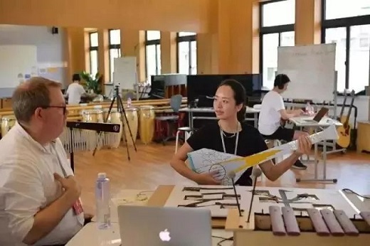 (云谷藝術(shù)周圖片:美國紐約大學(xué)的Alex教授攜其團(tuán)隊(duì)向?qū)W生展示變廢為寶:廢舊紙板、錫紙、電線,稚拙的繪畫點(diǎn)綴,最后成為簡易“樂器”。)