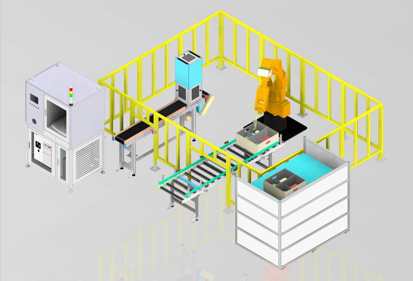 機器人分揀準裝箱工作站通過機器視覺識別來料形狀及顏色并進行 定位,發送給機器人位置坐標,機器人通過吸盤 式手爪將輸送線上產品取出裝入定制箱體內,同 時進行有序碼放,裝箱完成后,輸送線將成品輸 送出工作站。