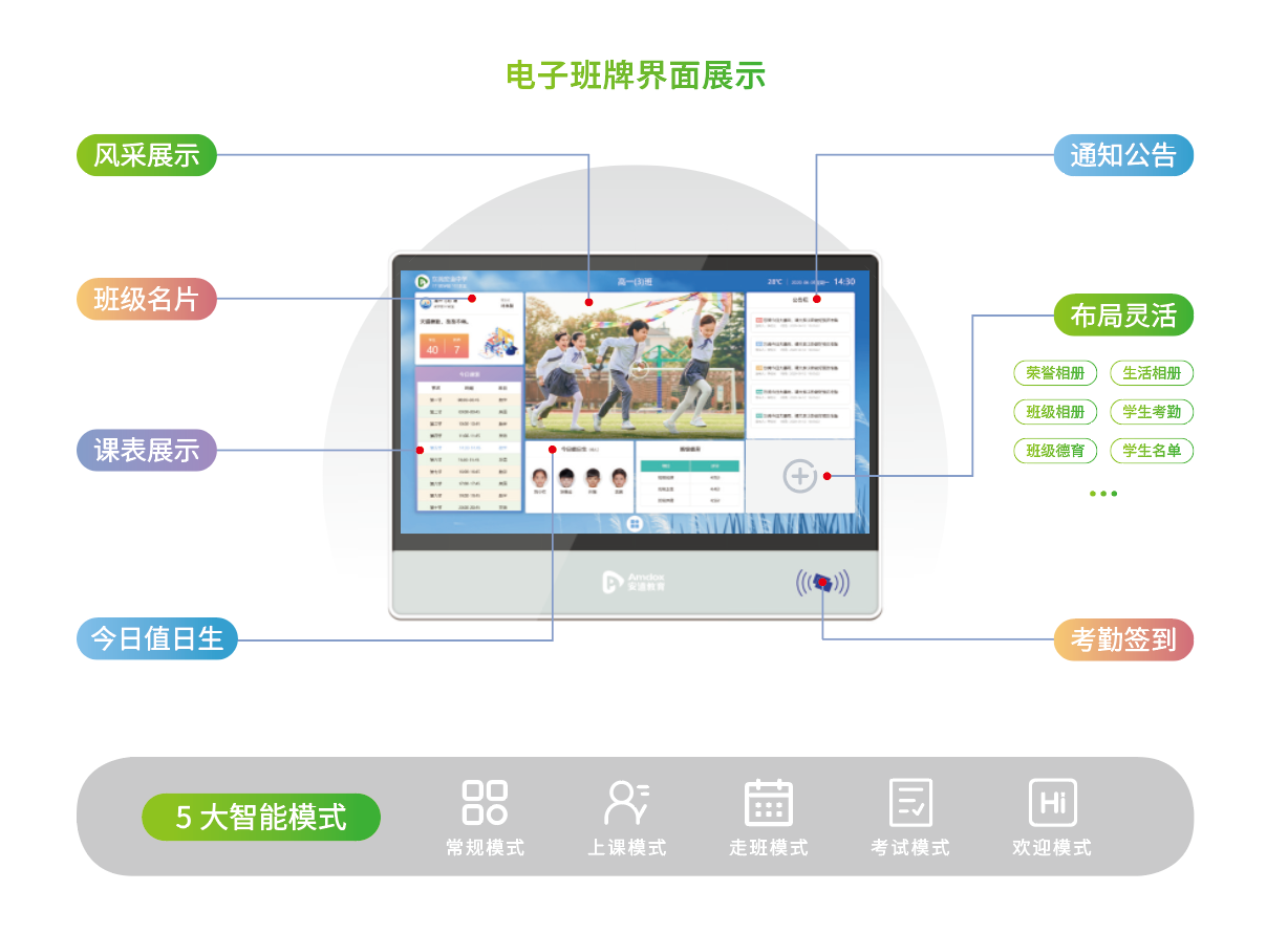 作為教育行業(yè)領(lǐng)先的設(shè)備制造商和解決方案服務(wù)商,安道教育不斷思索教育和學(xué)習(xí)的本質(zhì),深入到學(xué)校,真正理解師生需求,針對(duì)學(xué)校、老師、家長(zhǎng)、學(xué)生不同角色的多種需求,為此推出的安道云班牌,是專為學(xué)校打造的校園文化建設(shè)、班級(jí)考勤、班級(jí)信息展示的信息化產(chǎn)品,具有展示校園文化、班級(jí)文化、學(xué)校安全教育、班級(jí)考勤、課程安排、活動(dòng)資訊、通知信息等輔助教學(xué)功能,搭建家校溝通橋梁,促進(jìn)家校共育,助力校園信息化建設(shè)。