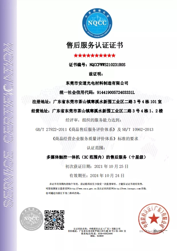 安道教育在提升產(chǎn)品品質(zhì)的同時,堅持以用戶為中心打造了專業(yè)的售后服務體系得到了權威機構認證,獲得十星級售后服務認證。