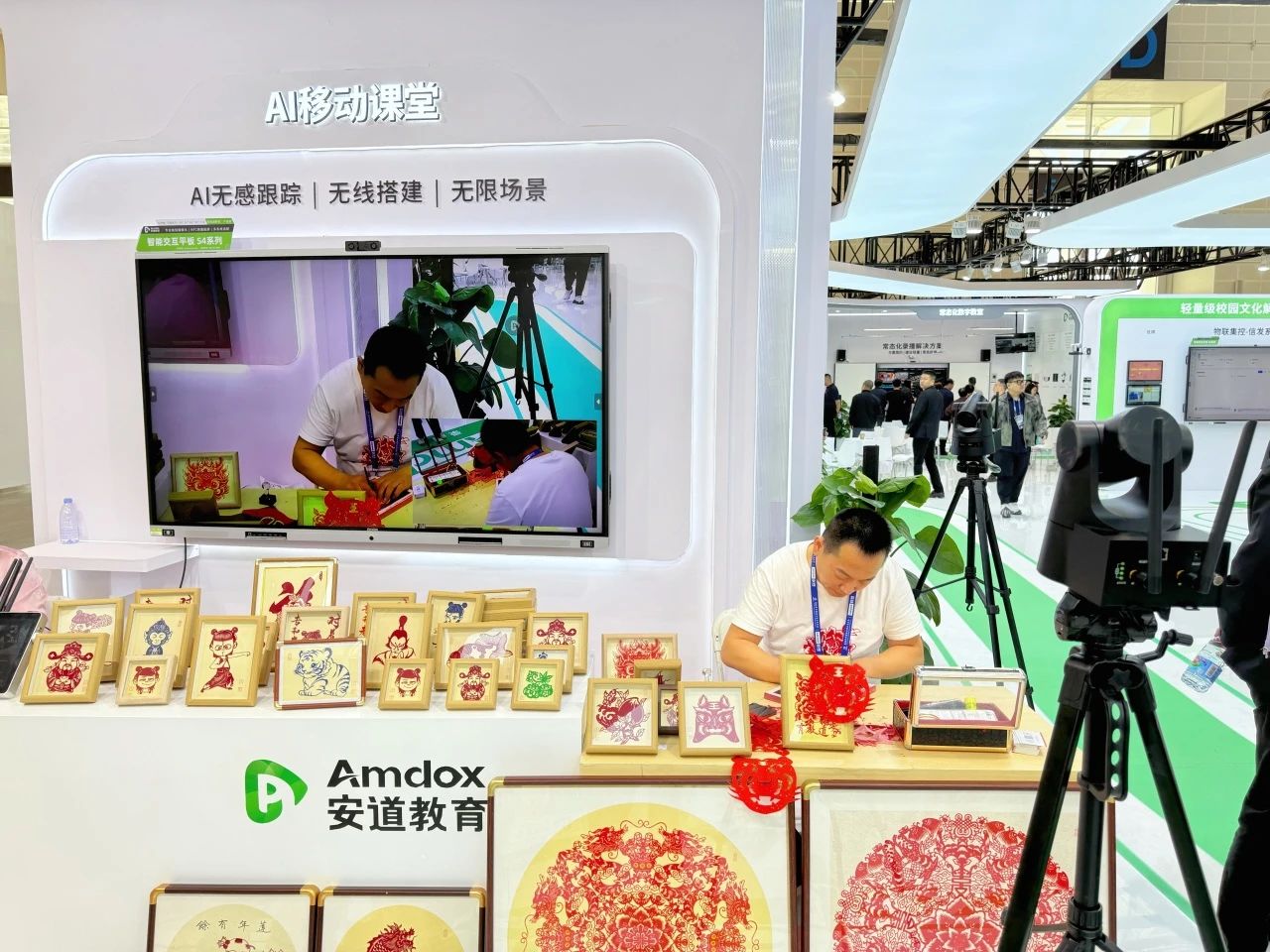 在安道AI移動課堂專區(qū),正進行著一場別開生面的非遺剪紙課堂。現(xiàn)場,沒有傳統(tǒng)便攜錄播系統(tǒng)線路的雜亂,連接復雜的布局,僅僅只有一臺便攜錄播一體機、一臺無線云臺攝像機、領夾麥克風,便輕松實現(xiàn)課堂現(xiàn)場的傳播與錄制。這節(jié)課堂同時也在線上同步直播,在AI技術的加持下,剪紙老師的剪紙畫面被賦予了更多的畫面特寫,讓線上收看直播的觀眾也能和現(xiàn)場觀眾一樣收看清晰現(xiàn)場畫面。
