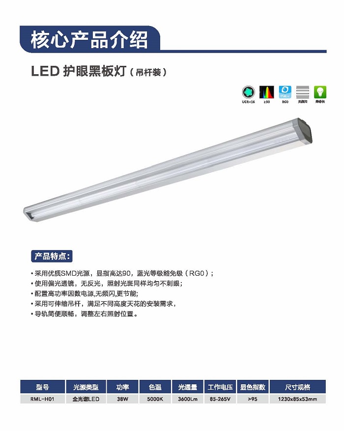 LED護眼黑板燈(吊桿裝)產品特點: