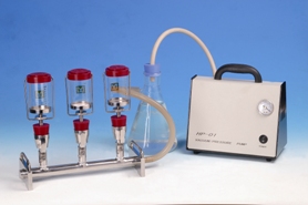 多聯過濾系統的組成: 系統過濾器支架,可換膜過濾器組件,過度瓶(收集瓶),真空泵組成。 支架采用316L不銹鋼材質,換膜過濾器采用特硬料玻璃除氫氟酸、熱磷酸外,對一般的酸具有耐腐蝕性是一款性價比很高的多聯過濾器。