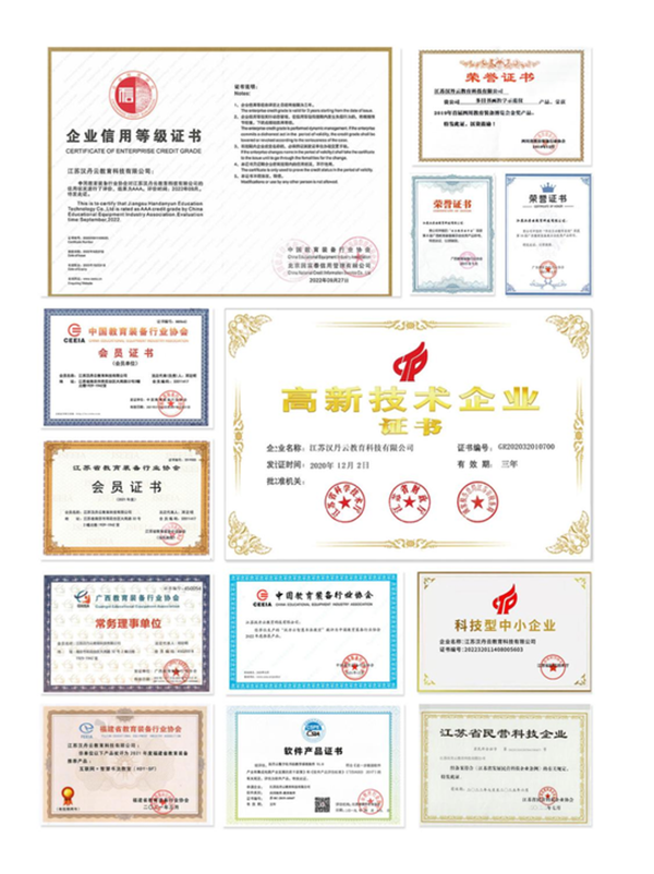 江蘇漢丹云教育科技有限公司是一家致力于數字化教育云平臺建設和大數據中心構建的高新技術企業,主要從事傳統文化與信息技術的創新融合研究,總部位于中國南京軟件谷,是國家級高新技術企業、軟件企業、江蘇省民營科技企業、江蘇省科技型中小企業、江蘇省第七批質量提升重點企業、南京市創新型中小企業;系中國教育裝備行業鉆石會員單位、江蘇省教育裝備行業理事單位、廣西教育裝備行業常務理事單位;企業已通過ISO9001質量管理體系、ISO14001環境管理體系、ISO45001職業健康安全管理體系、ISO27001 信息安全管理體系和ISO20000信息技術服務管理體系認證,先后榮獲四川教育裝備博覽會金獎產品、福建省2021年度教育裝備推薦產品、廣西教育裝備展示會優秀產品,中國教育裝備行業協會2022年度推薦產品等榮譽。