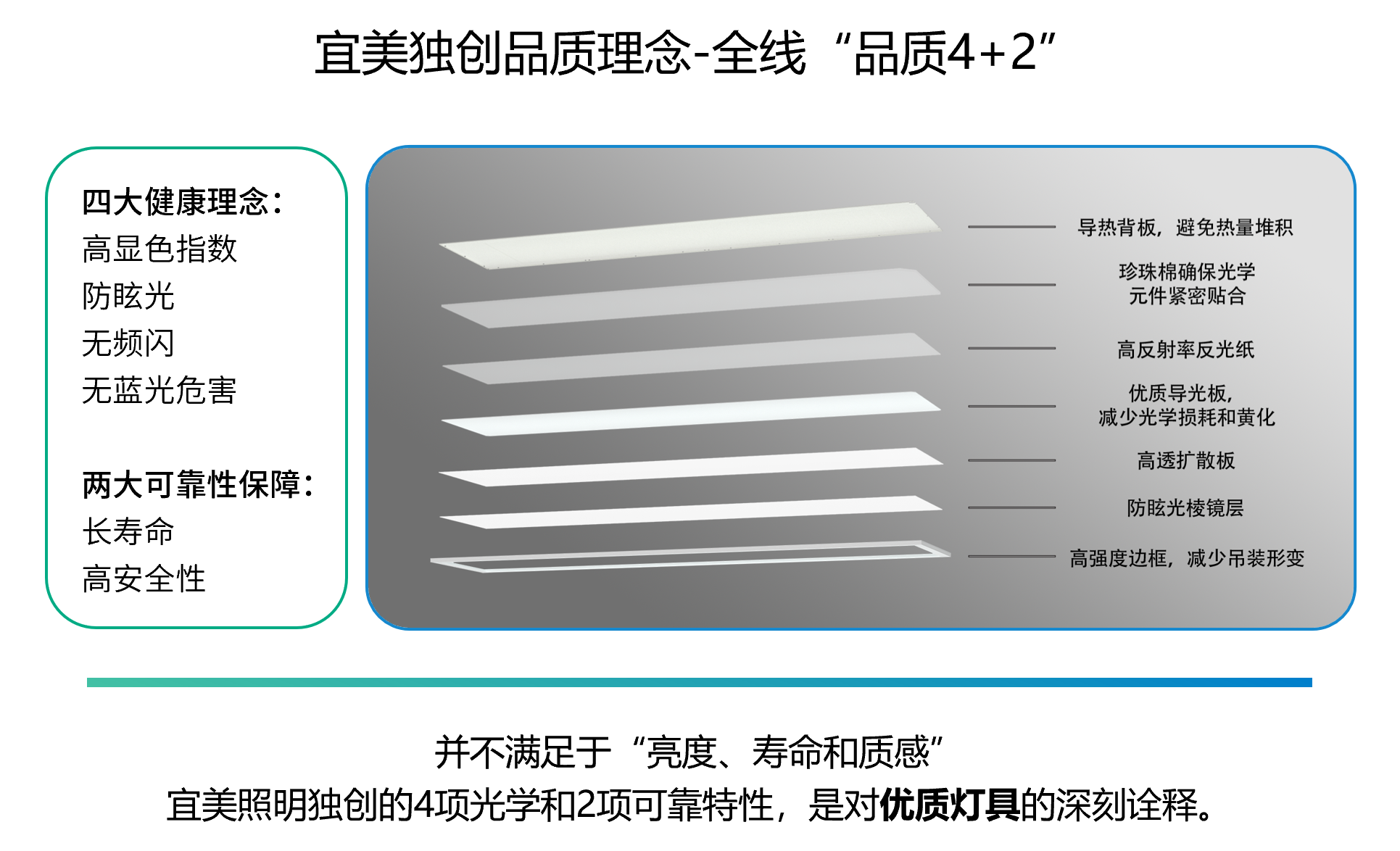 青少年的健康成長是一個嚴肅的話題,卓越的品質(zhì)也是宜美照明不容妥協(xié)的追求。自宜美照明進駐國內(nèi)市場以來,所有的燈具產(chǎn)品便具備了“4+2”,品質(zhì)“4+2”是宜美照明獨創(chuàng)的品質(zhì)理念,其中包含“高顯色性、無可視頻閃、防眩光、無藍光、長壽命、高安全性”。為此,宜美照明的一百余位設計師和工程師不懈努力,為國內(nèi)市場研發(fā)了一系列品質(zhì)超前、技術領先的教育、商用和家居燈具產(chǎn)品。