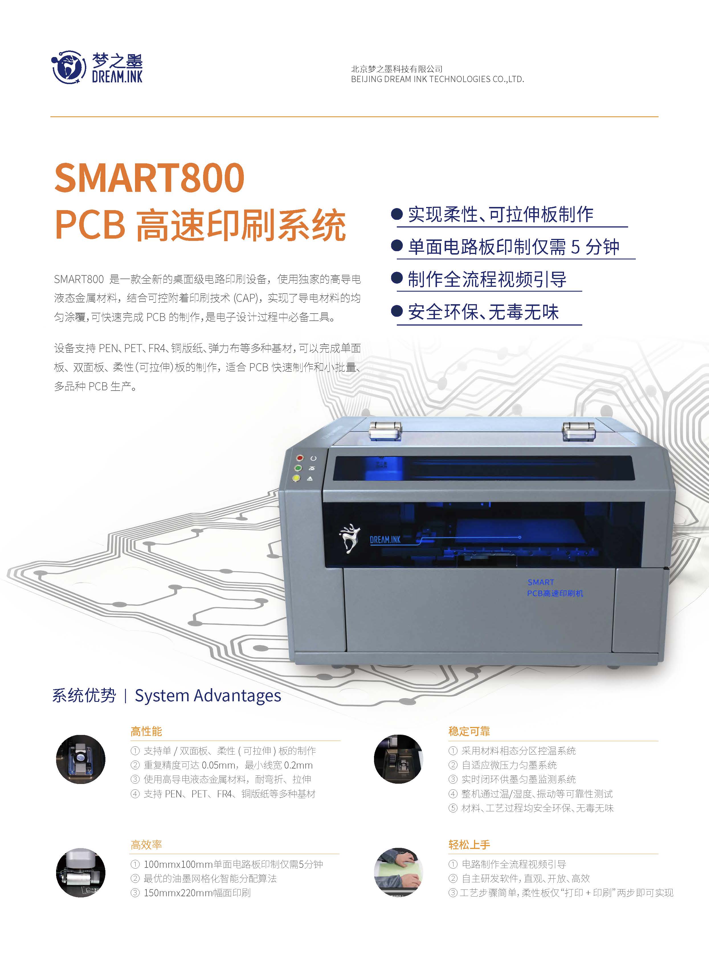 產品詳細介紹產品簡介 SMART800 是一款全新的桌面級電路印刷設備,使用高導電液態金屬材料,結合可控附著印刷技術(CAP),實現了導電材料的均勻涂覆,可快速完成PCB 的制作,是電子設計過程中必備工具。 設備支持PEN、PET、FR4、銅版紙、彈力布等多種基材,可以完成單面板、雙面板、柔性(可拉伸)板的制作,適合PCB 快速制作和小批量、多品種PCB 生產。 產品特點 1、高性能 ① 支持單/ 雙面板、柔性( 可拉伸) 板的制作; ② 重復精度可達0.05mm,最小線寬0.2mm; ③ 使用高導電液態金屬材料,耐彎折、拉伸; ④ 支持PEN、PET、FR4、銅版紙等多種基材。 2、穩定可靠 ① 采用材料相態分區控溫系統; ② 自適應微壓力勻墨系統; ③ 實時閉環供墨勻墨監測系統; ④ 整機通過溫/濕度、振動等可靠性測試; ⑤ 材料、工藝過程均安全環保、無毒無味。 3、效率高 ① 100mmx100mm單面電路板印制僅需5分鐘; ② 油墨網格化智能分配算法; ③ 150mmx220mm幅面印刷。 4、輕松上手 ① 電路制作全流程視頻引導; ② 自主研發軟件,直觀、開放、效率高; ③ 工藝步驟簡單,柔性板僅“打印 + 印刷”兩步即可實現。 |