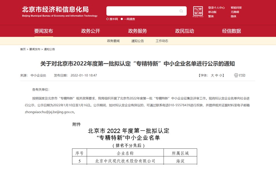 近日,北京市公布了2022年度第一批擬認定“專精特新”中小企業(yè)名單。致力于人工智能創(chuàng)新、專注以技術(shù)服務(wù)教育的北京中慶現(xiàn)代技術(shù)股份有限公司成功入選名單。