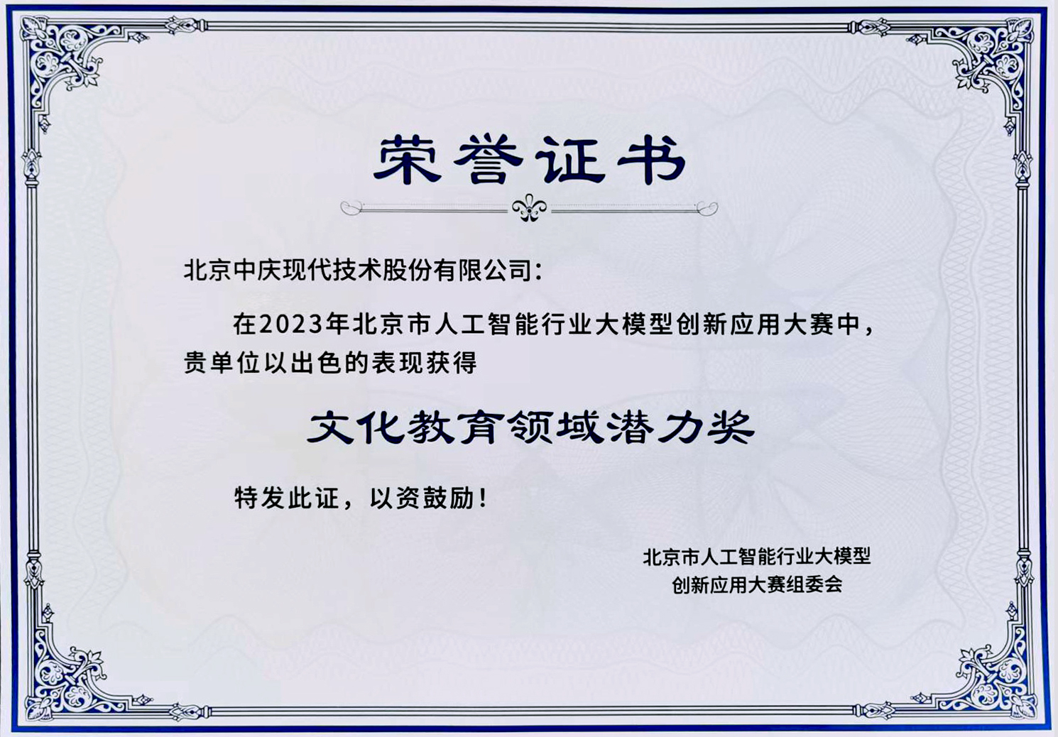 近日,2024中關村論壇年會在北京召開,在大會“人工智能主題日”主論壇——未來人工智能先鋒論壇中正式公布了北京市行業大模型創新應用大賽獲獎名單并頒獎。在文化教育領域賽道,北京中慶現代技術股份有限公司順利通過復賽榮獲文化教育領域潛力獎。