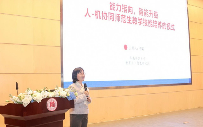 華南師范大學(xué)教育人工智能研究院副院長穆肅教授作為特約專家,做題為“能力指向,智能升級,人-機(jī)協(xié)同師范生教學(xué)技能培養(yǎng)的模式”的主題報(bào)告。