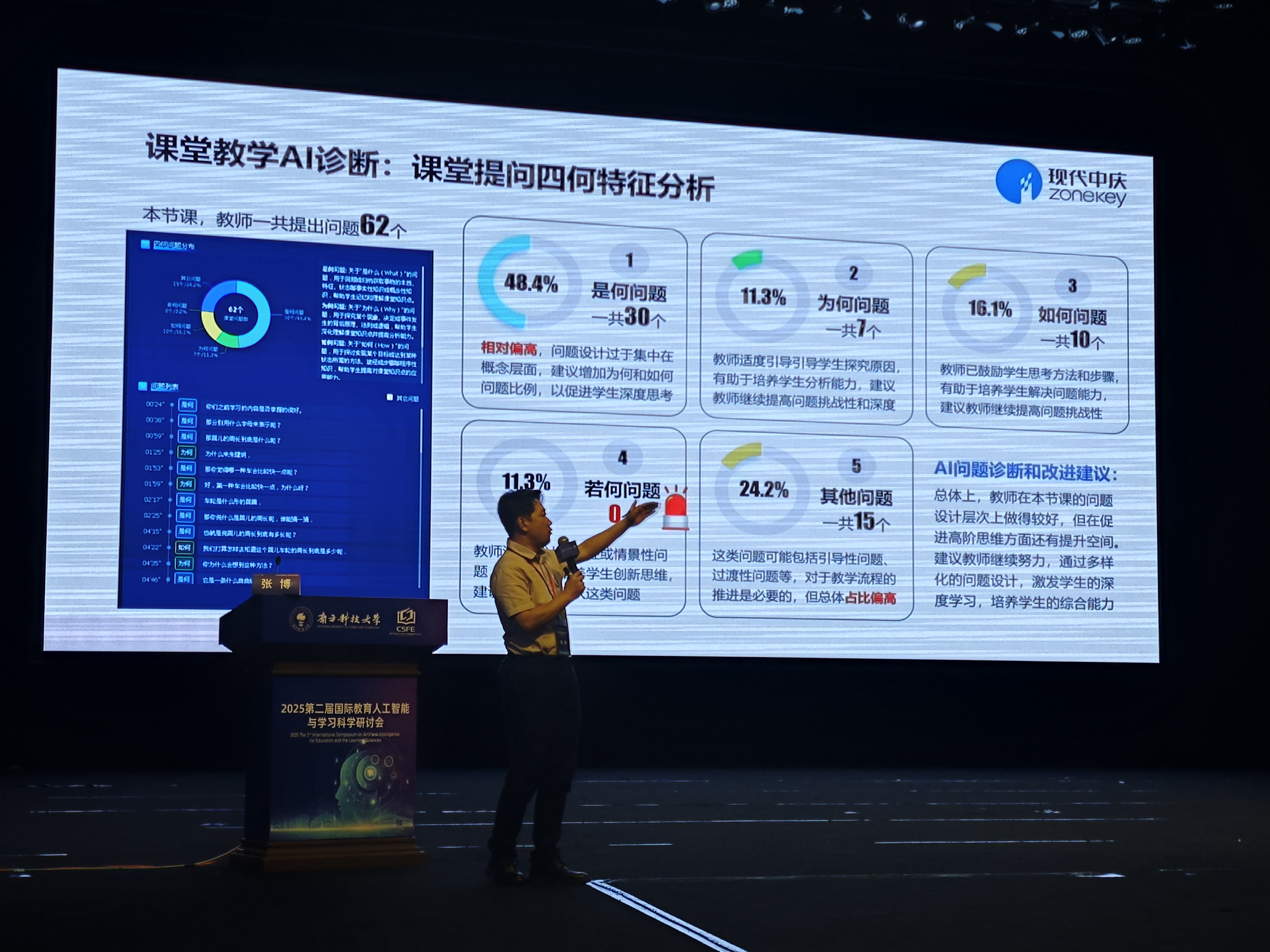 會議圍繞人工智能與學習科學融合發展的最新成果與未來趨勢展開深入交流,共同探討教育的重構路徑與創新方向。在大會“數智科技前沿論壇”中,現代中慶張博做“基于AI數據的教師數字素養提升:從精準診斷到專業成長的閉環路徑”報告,闡述了AI賦能下教研從經驗主義向數據實證轉變的教師專業成長新范式。