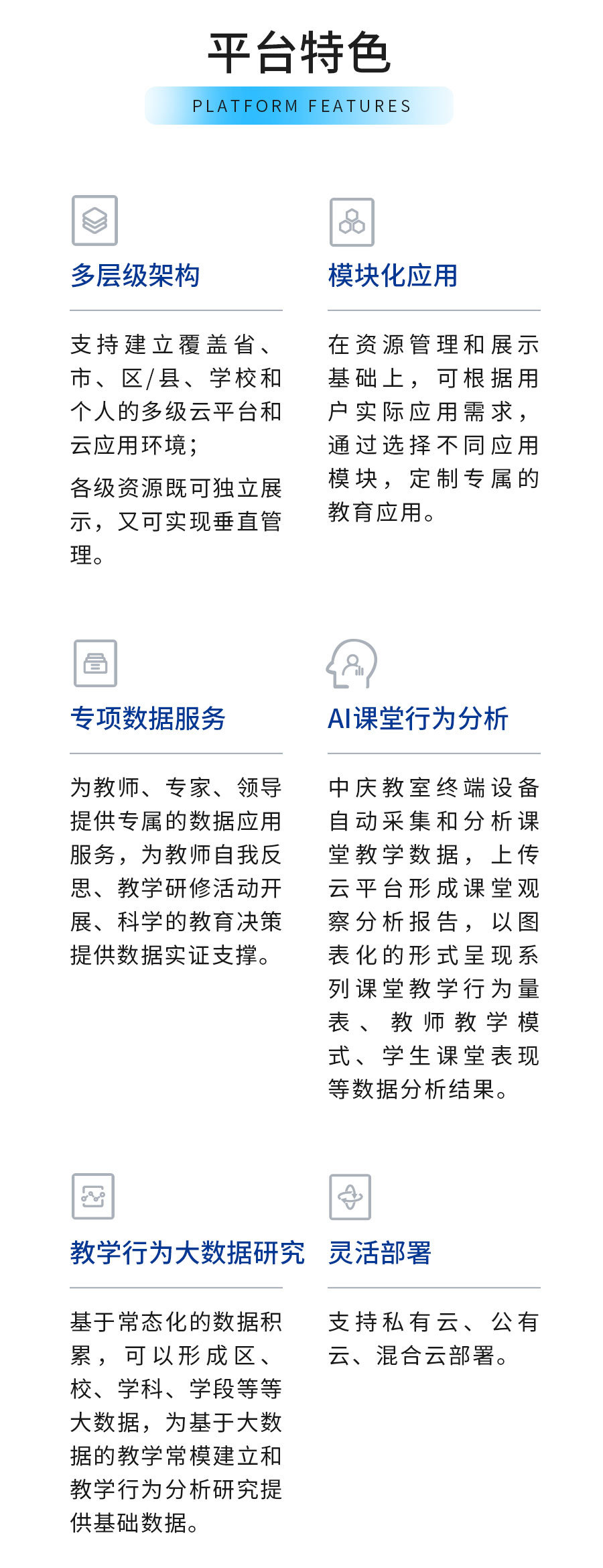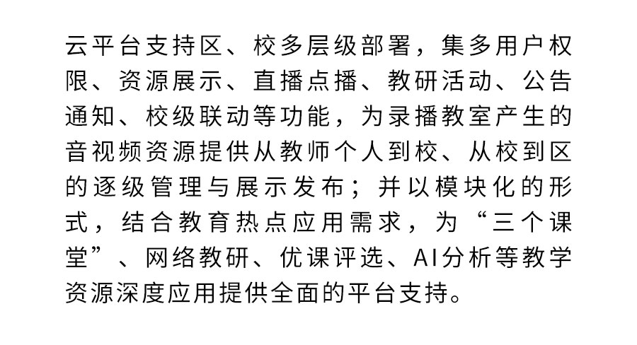 | AI教研應(yīng)用、錄播系統(tǒng)、智慧教室、“三個(gè)課堂”解決方案等 |